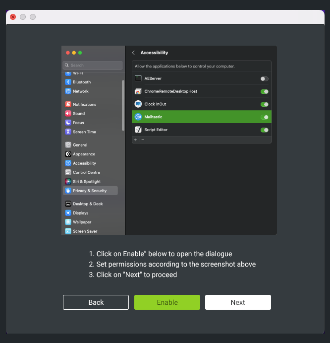 "Accessibility" öffnen > Mailtastic aktivieren