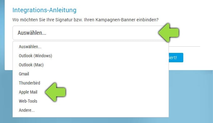 Folgen Sie dem Prozess, bis Sie den Bereich “Anleitung” erreichen. Scrollen Sie runter bis Sie den Punkt “Integrations-Anleitung” erreichen und wählen Sie im Dropdown-Menü den Punkt “Apple Mail” aus.