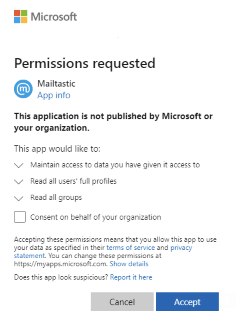 Dieser Dialog wird Ihnen angezeigt, bevor Sie eine Integrationsverbindung zwischen der Mailtastic App und Ihrer Organisation herstellen: