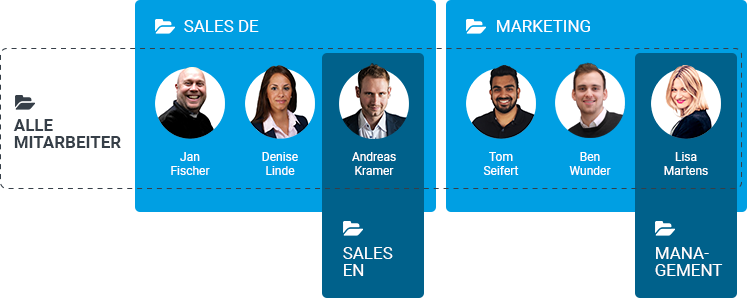 In unserem Beispiel gibt es sechs Mitarbeiter die sich auf insgesamt fünf Abteilungen verteilen, wobei alle Mitarbeiter mehreren Abteilungen (Sales DE, Sales EN, Marketing, Management, Alle Mitarbeiter) zugewiesen wurden, um jedem Mitarbeiter mehrere Signaturen zur Verfügung zu stellen: