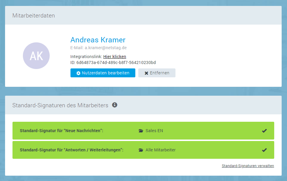 Welche Standard-Signaturen für Ihre Mitarbeiter aktiv sind, können Sie auch im Mitarbeiterprofil sehen: