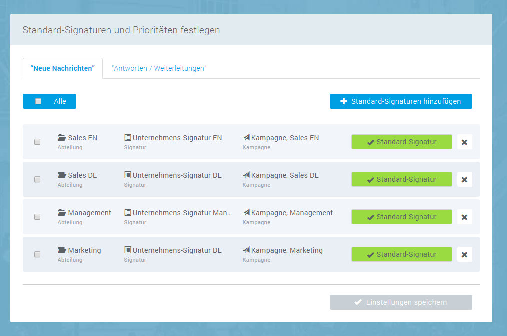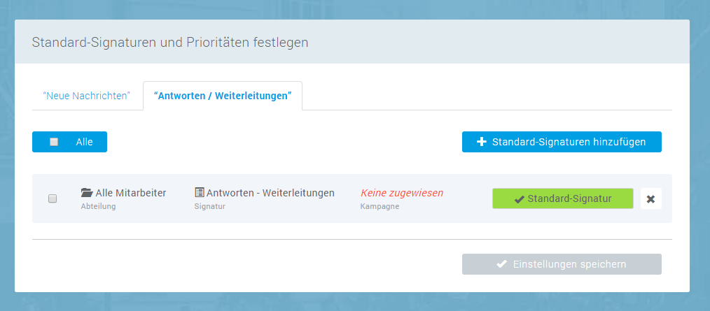 Nachdem alle Mitarbeiter den entsprechenden Abteilungen zugewiesen wurden und die Abteilungen mit den passenden Signaturen und Kampagnen-Bannern verknüpft wurden, werden die Standard-Signatur-Einstellungen getroffen: