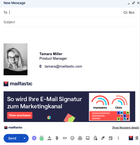 Das wars! Nachdem Sie sich bei EasySync angemeldet haben, bekommen Sie die E-Mail-Signaturen zur Verfügung gestellt, die Ihr Mailtastic-Admin Ihnen zugewiesen hat. Die Signaturen können Sie auswählen, indem Sie auf das kleine blaue Mailtastic-Icon im "Neue Nachricht verfassen"-Fenster.