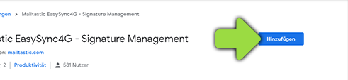 Bitte stellen Sie sicher, dass Sie die neuste Version von Chrome nutzen. Öffnen Sie den Chrome Web Store und fügen Sie die "Mailtastic EasySync4G Chrome-Extension" hinzu, indem Sie auf "Hinzufügen" und "Erweiterung hinzufügen" klicken.