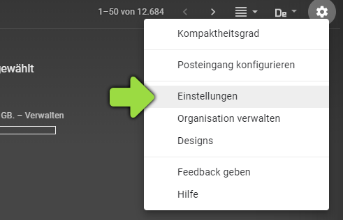 Öffnen Sie Gmail, klicken Sie rechts oben auf das Zahnrad-Symbol und wählen Sie "Einstellungen" aus.