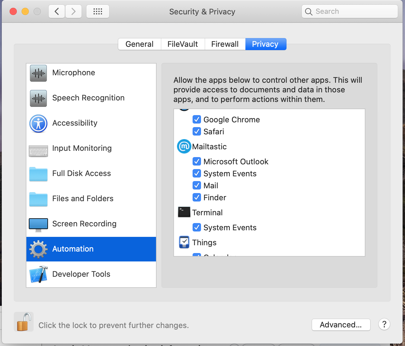 8. Aktivieren Sie "Microsoft Outlook", "System Events", "Mail" und "Finder"