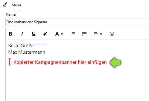 Sofern Sie einen Kampagnen-Banner zugeordnet bekommen haben, fügen Sie diesen mit einem Absatz Abstand unter den bestehenden Signatur-Text ein.