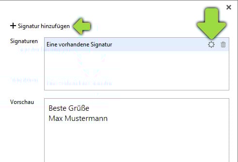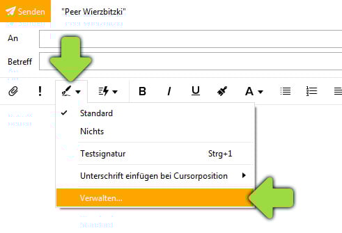 Klicken Sie auf das Signaturen-Symbol und wählen Sie den Menüpunkt "Verwalten".