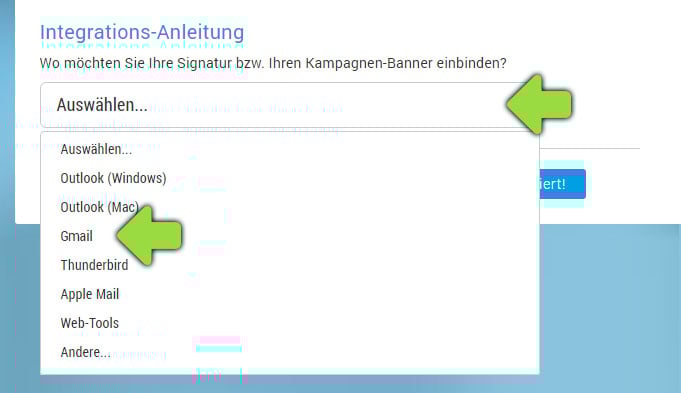 Folgen Sie dem Prozess, bis Sie den Bereich “Anleitung” erreichen. Scrollen Sie runter bis Sie den Punkt “Integrations-Anleitung” erreichen und wählen Sie im Dropdown-Menü den Punkt “Gmail” aus. Keine Sorge, hier sind Sie richtig: Outlook Web App hat den gleichen Integrationsprozess wie Gmail.