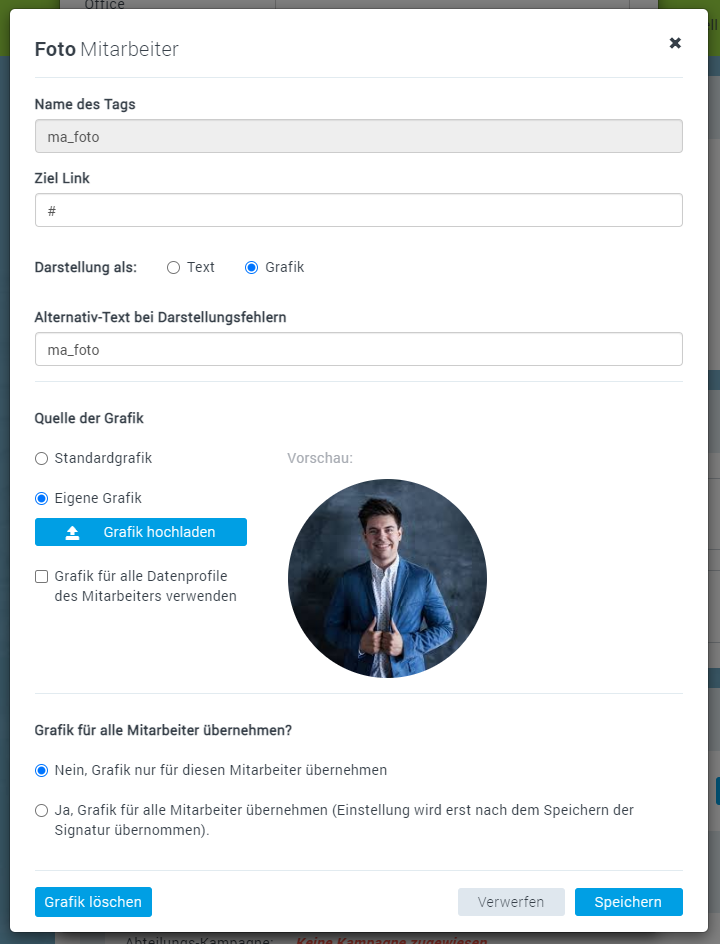 Laden Sie das Nutzerbild hoch und definieren Sie, für welche Datenprofile das Benutzerbild übernommen werden soll, und ob es ggf. verlinkt werden soll.