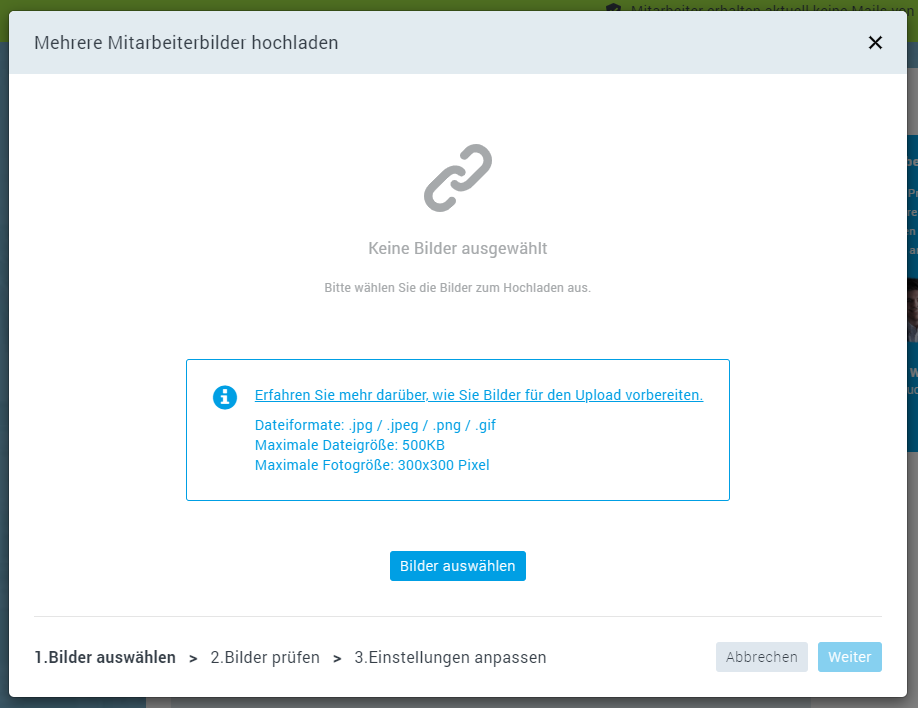 Wählen Sie im nächsten Schritt die entsprechenden Mitarbeiterbilder aus und folgenden Sie dem Upload-Assistenten.