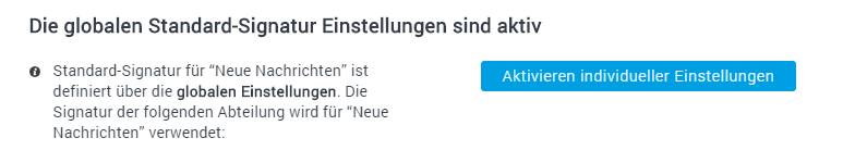 Die Einstellung "Global" ist standardmäßig aktiviert, d.h. jeder Mitarbeiter erhält die Standard-Signatur, die für ihn per Globaler Standard-Einstellung hinterlegt ist. Mehr zu Standard-Signaturen finden Sie hier. Soll der Mitarbeiter eine andere Standard-Signatur erhalten (oder gar keine) wählen Sie bitte "Individuelle Einstellungen".