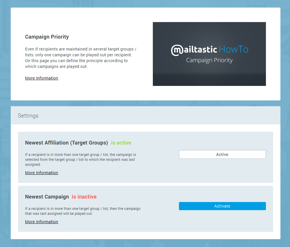 Wir bieten zwei verschiedene Möglichkeiten an, um zu bestimmen, welche Kampagne für einen Empfänger ausgespielt wird, wenn die Zuordnung zu einer Zielgruppe oder Kampagne aufgrund seiner Zugehörigkeit zu mehreren CRM-Listen, die mit Mailtastic-Kontaktzielgruppen verknüpft sind, nicht eindeutig ist.