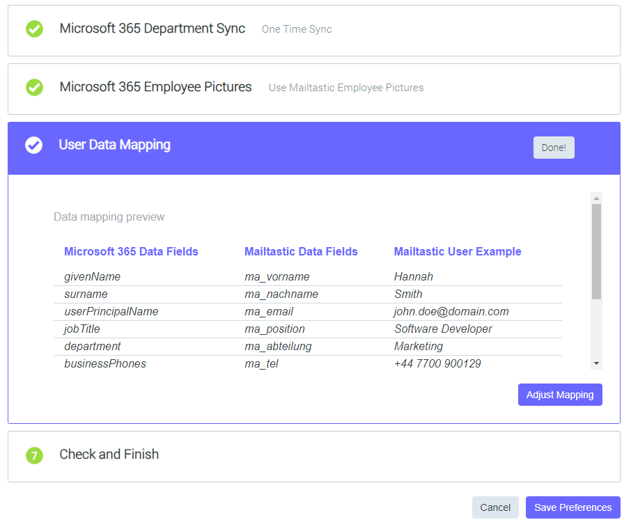 Nachdem Sie die Grundeinstellungen vorgenommen haben können Sie im letzten Schritt das Mapping der Microsoft 365-Nutzerdaten und der Mailtastic-Nutzerdaten anpassen. Hier definieren Sie, welche Nutzerinformationen eines Microsoft 365-Nutzers zu welchen Nutzerinformationen bei Mailtastic übertragen werden sollen.
