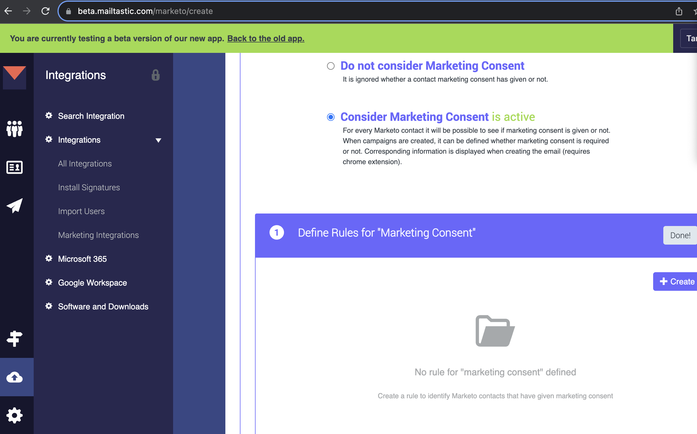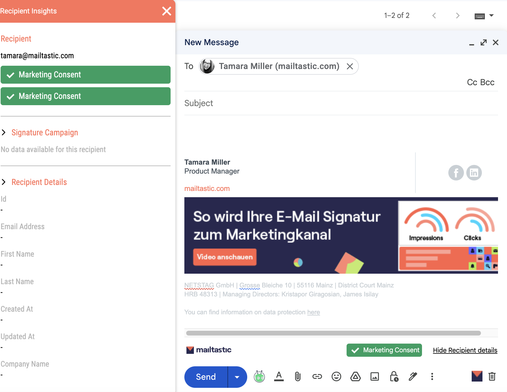 Die Mailtastic Chrome Extension ist jetzt intelligenter als je zuvor. Falls nicht jeder Empfänger Ihrer empfängerbasierten Kampagne seine Marketingeinwilligung erteilt hat, werden diese Informationen nicht nur in der Chrome-Erweiterung angezeigt, sondern es werden Ihnen auch automatisch nur verfügbare Kampagnen angezeigt, die allen Ihren Empfängern entsprechen, um sicherzustellen, dass Sie die DSGVO einhalten.