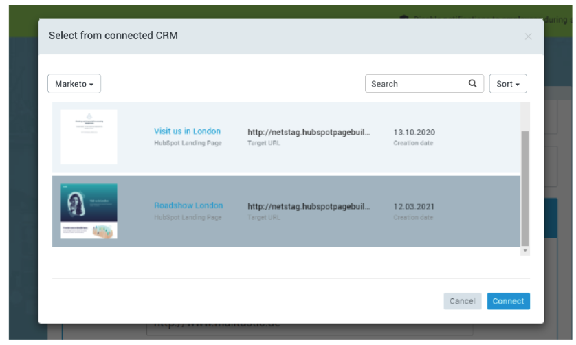 Klicken Sie bei der Erstellung einer empfängerbasierten Kampagne im Bereich "Zielseite auswählen" einfach auf "Aus verbundenen CRMs auswählen" und wählen Sie eine Marketo Landingpage aus.