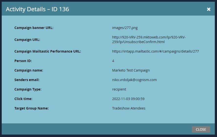 Innerhalb von Marketo wird eine Aktion am Kontact erzeugt, wenn dieser auf eine Mailtastic-Kampagne geklickt hat. Die Aktion kann als Trigger für weiter Marketing-Automation-Prozesse innerhalb von Marketo verwendet werden, wie z.B. Workflows.