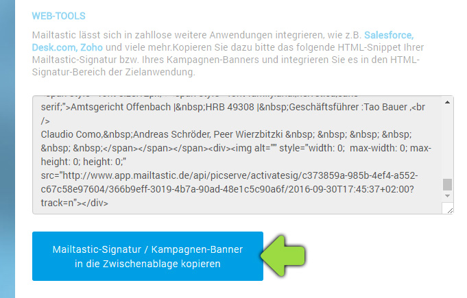 Scrollen Sie runter und klicken Sie auf den blauen Button “Mailtastic-Signatur / Kampagnen-Banner in die Zwischenablage kopieren”, um den Integrations-Code zu kopieren.