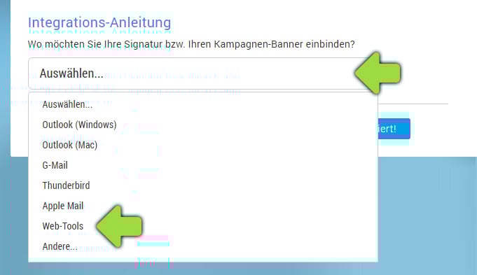 Folgen Sie dem Prozess, bis Sie den Bereich “Anleitung” erreichen. Scrollen Sie runter bis Sie den Punkt “Integrations-Anleitung” erreichen und wählen Sie im Dropdown-Menü den Punkt“Web-Tools” aus.