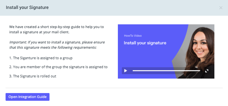 Next, make sure to read the steps to make sure you have completed each of them in order to use the signature you would like to install (i.e assigned the signature to a group you are assigned to). Then click on "Open Integration Guide" to open the integration link in order to install your signature.