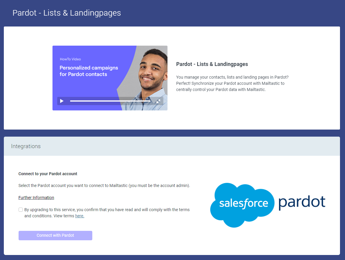 Navigieren Sie zum Menüpunkt "Integrationen", klicken Sie auf "Marketing Integrationen", öffnen Sie die Pardot-Integration und verbinden Sie sich mit Ihrem Pardot-Konto.