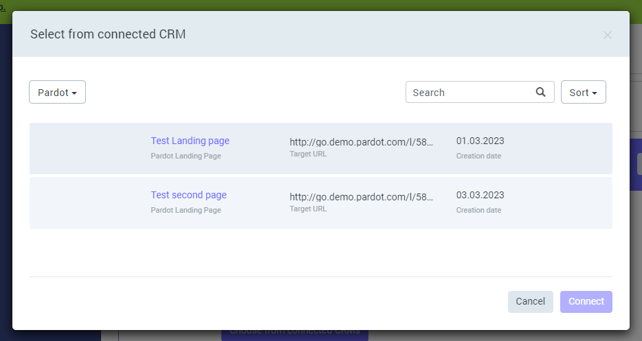 Klicken Sie bei der Erstellung einer empfängerbasierten Kampagne im Abschnitt "Zielseite auswählen" einfach auf "Aus verbundenen CRMs auswählen" und wählen Sie eine Pardot-Landingpage aus.