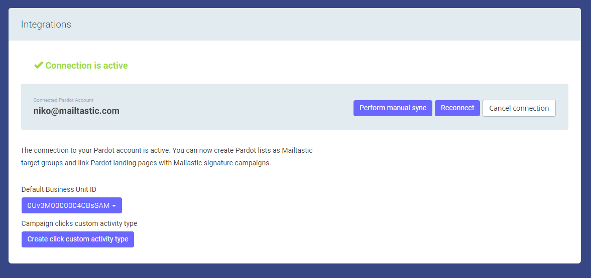 Nachdem Sie die Verbindung erstellt haben, aktivieren Sie in den Einstellungen der Pardot-Integration "Benutzerdefinierten Klick-Aktivitätstyp erstellen", wenn Sie Klicks auf Mailtastic-Signaturkampagnen in Pardot sichtbar machen möchten.