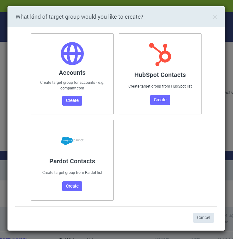 Navigieren Sie zu "Marketing" -> "Zielgruppen", um eine neue Zielgruppe zu erstellen. Wählen Sie "Pardot-Kontakte", um eine Mailtastic-Zielgruppe aus einer bestehenden Pardot-Liste zu erstellen.