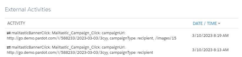 Klicks auf Mailtastic-Kampagnen, die von Pardot-Kontakten mit korrespondierenden Informationen generiert wurden