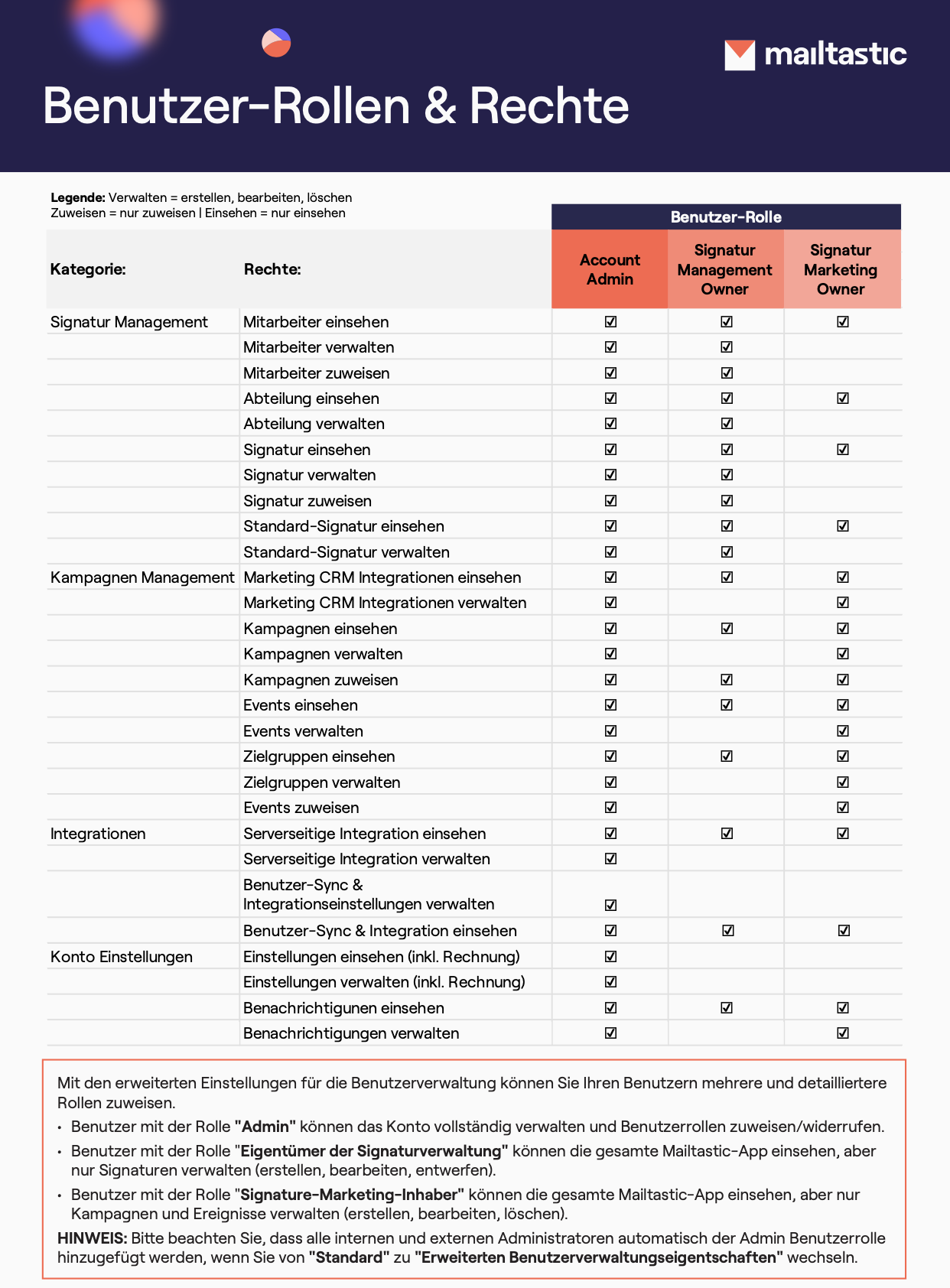 Der Mailtastic-Kontoinhaber kann Benutzer einladen und ihnen eine oder mehrere der folgenden Benutzerrollen zuweisen:
