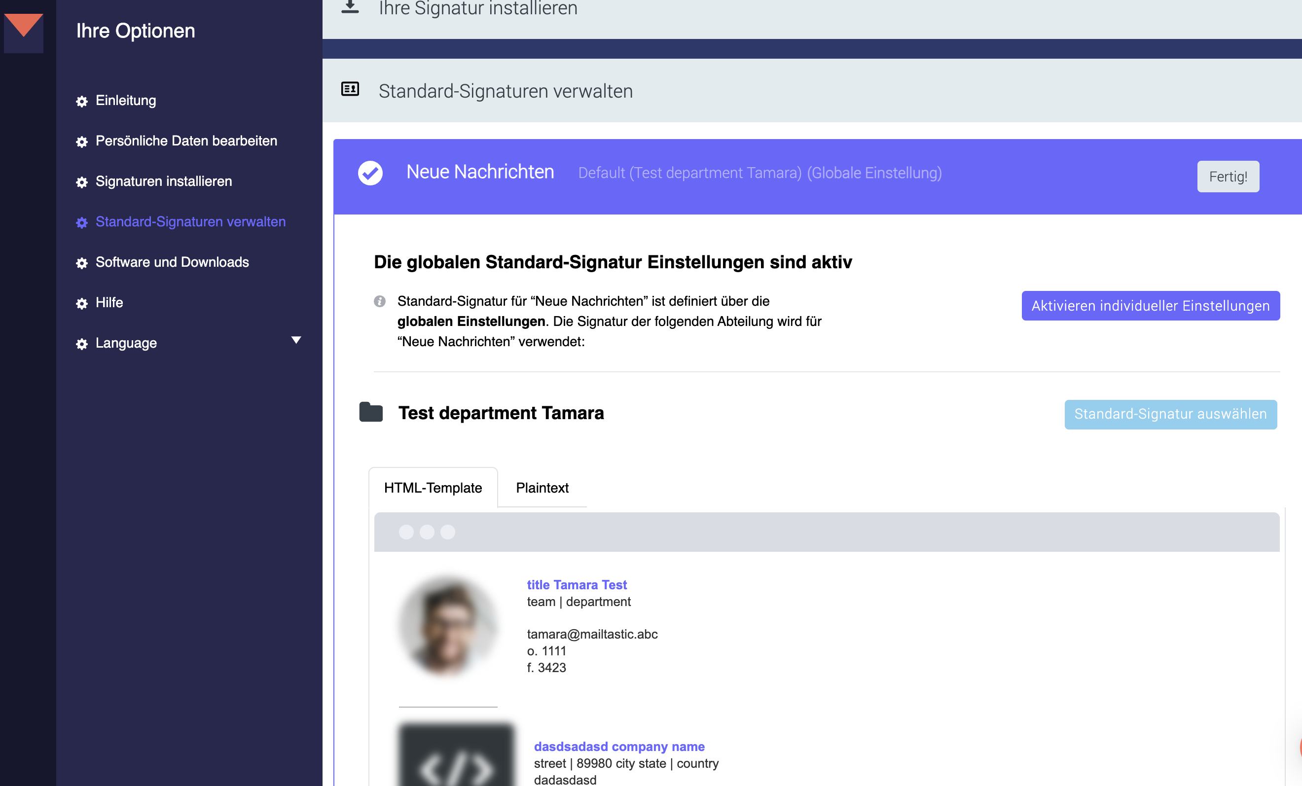 Ihr Mailtastic-Administrator muss in der Beta-App die Funktionalität “Individuelle Standard-Signatur einrichten” unter “Einstellungen” aktivieren.