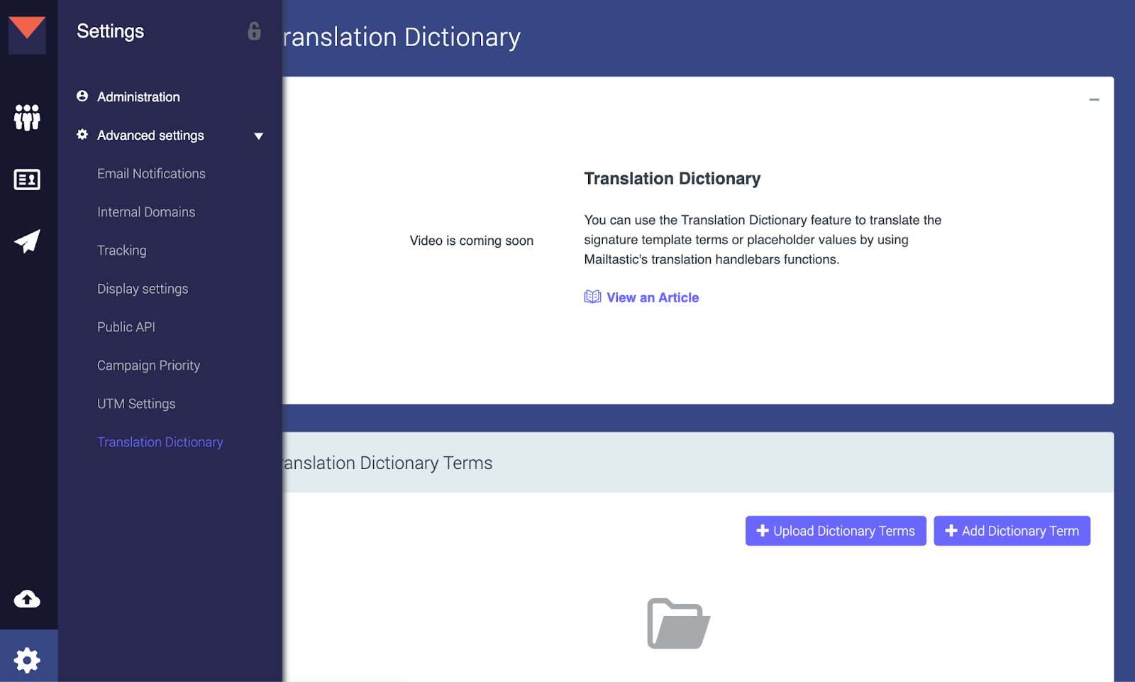 The Mailtastic admin will find the new feature in in the “Settings” - “Advanced Settings” section under “Translation Dictionary”