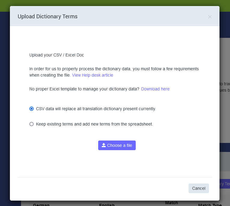 Upload dictionary terms: here you will find a panel for uploading your own spreadsheet of translations (if you don’t have one there is a template to download it from that panel) with two choices: