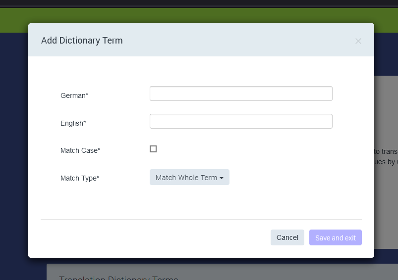Add dictionary term: Here you will find a panel to add a term manually by entering the German and English versions of the term