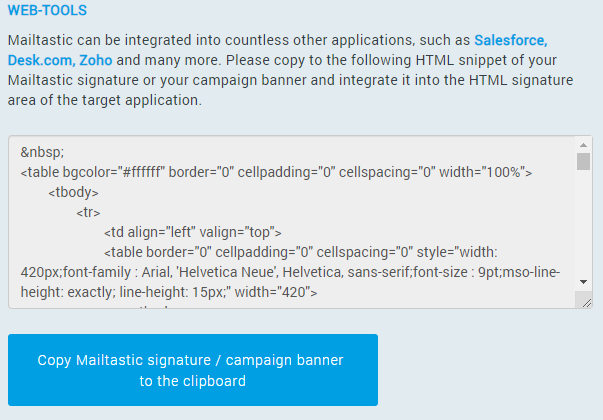 Scroll down and click on the blue button "Copy Mailtastic Signature / Campaign Banner to Clipboard" to copy the integration code.
